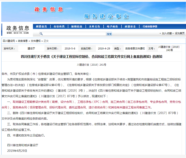 四川住建廳關(guān)于修改《關(guān)于建設(shè)工程招標(biāo)控制價(jià)、合同和竣工結(jié)算文件實(shí)行網(wǎng)上備案的通知》的通知